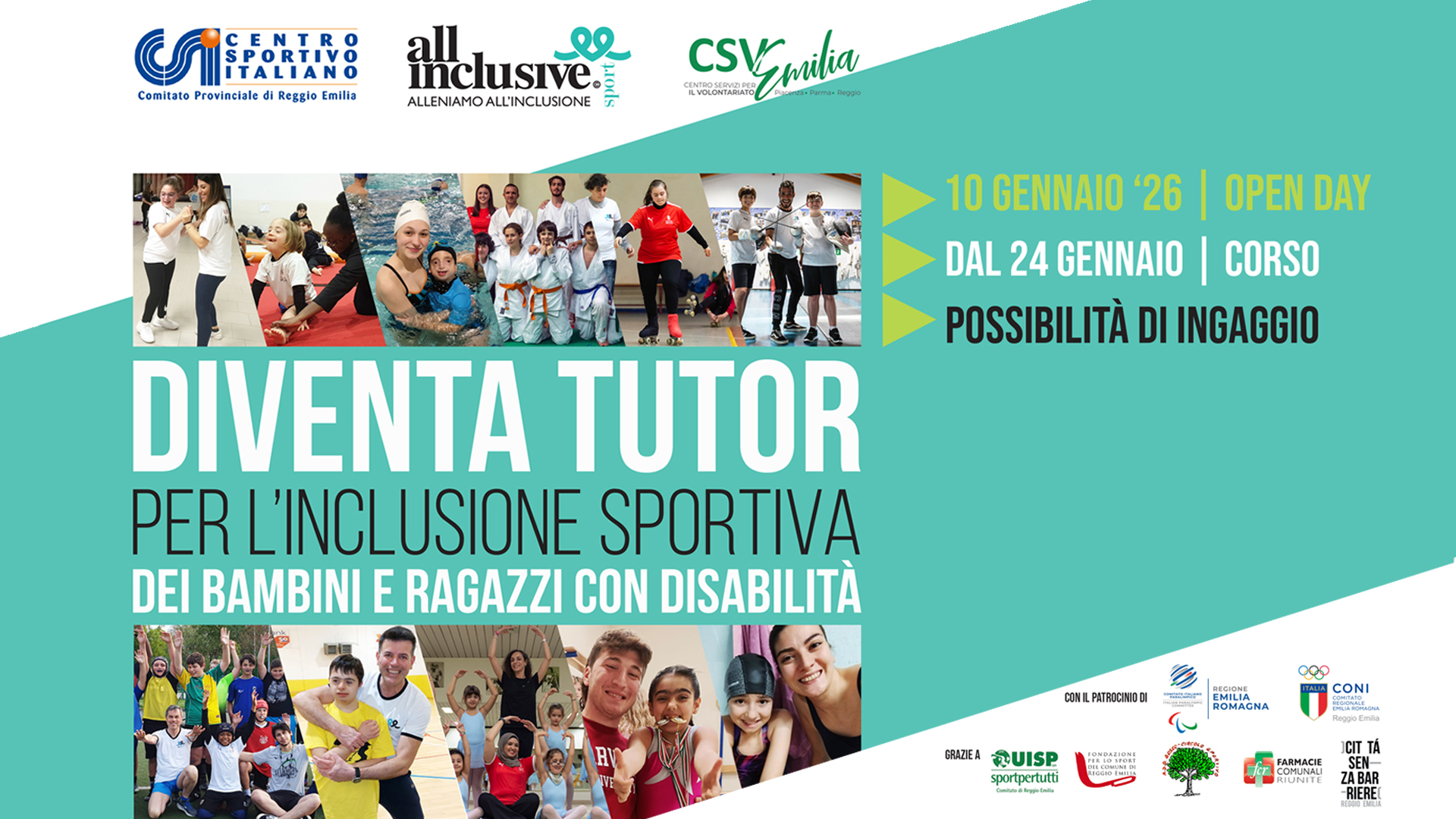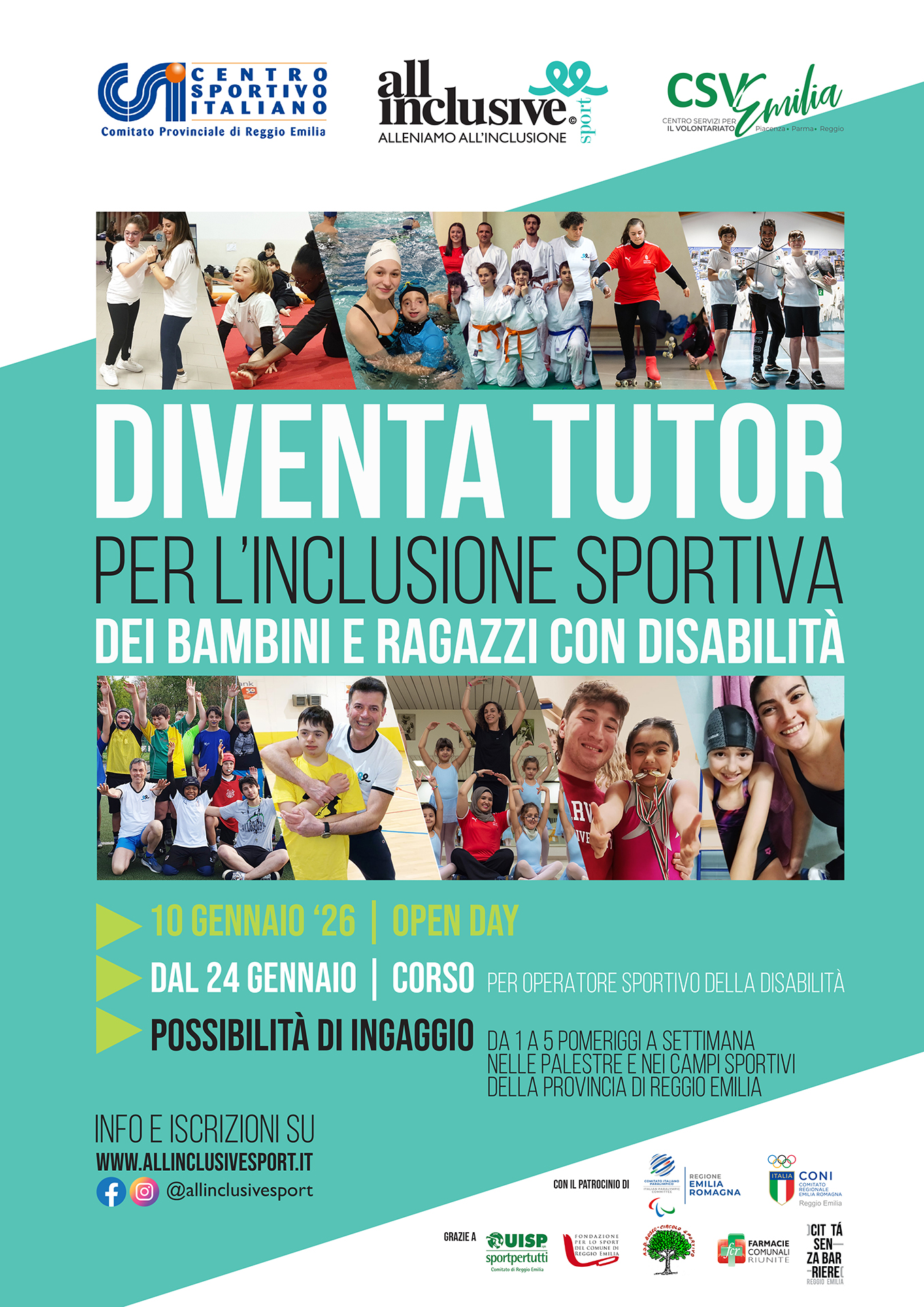 - Inserimento nel database dei tutor di All Inclusive Sport, con possibilità di ingaggio da 1 a 5 pomeriggi a settimana, a fianco di uno o più bambini con disabilità, nelle associazioni sportive della provincia di Reggio Emilia. Il contratto per l’incarico come Operatore Sportivo della Disabilità sarà firmato direttamente con il CSI Centro Sportivo Italiano, sede di Reggio Emilia: la retribuzione oraria prevista è in linea con gli altri compensi da Operatore Sportivo.