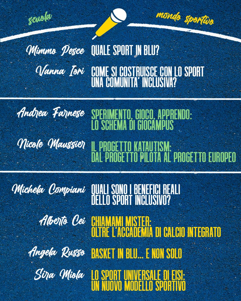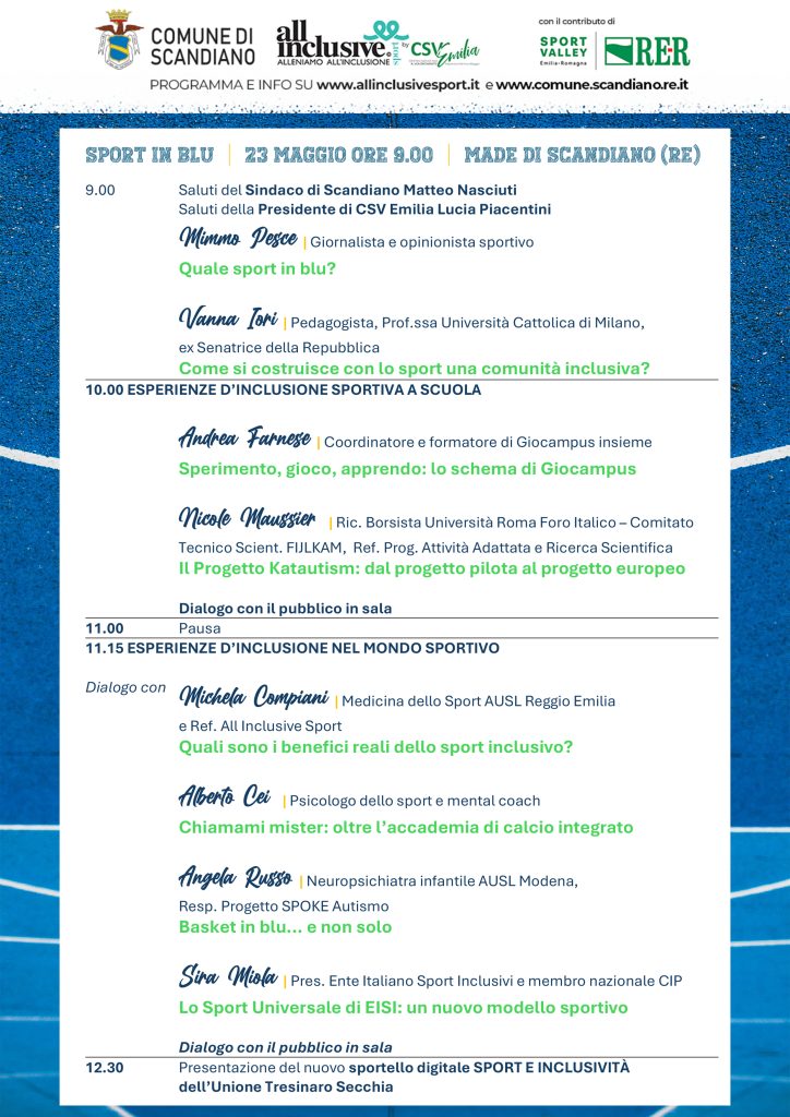 Il 23 maggio abbiamo invitato al MADE di Scandiano un serie di ospiti che hanno realizzato progetti sportivi virtuosi: esperienze concrete di inclusione di persone con autismo o altre neurodivergenze, nella scuola e nello sport pomeridiano, a livello nazione e internazionale. Progetti in cui fiducia, armonia e profondità si realizzano in dinamiche di gruppo positive. Siamo certi che ascoltarli vi sarà d’ispirazione.