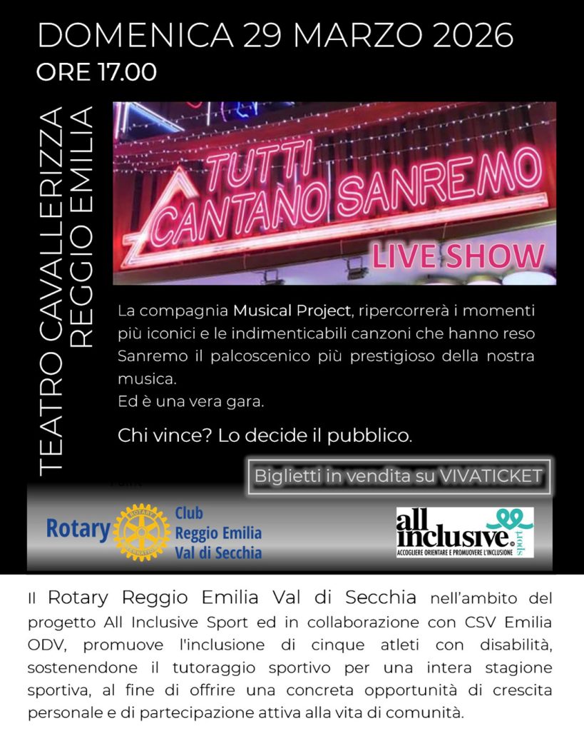 Il Rotary Club Reggio Emilia Val di Secchia organizza al Teatro La Cavallerizza di Reggio Emilia lo spettacolo TUTTI CANTANO SANREMO della Compagnia Musical Project. Una gara fra le canzoni storiche più amate della storia del Festival, cantate dalla compagnia Musical Project e votate dal pubblico, con vincitore finale: un evento live emozionante e divertente.